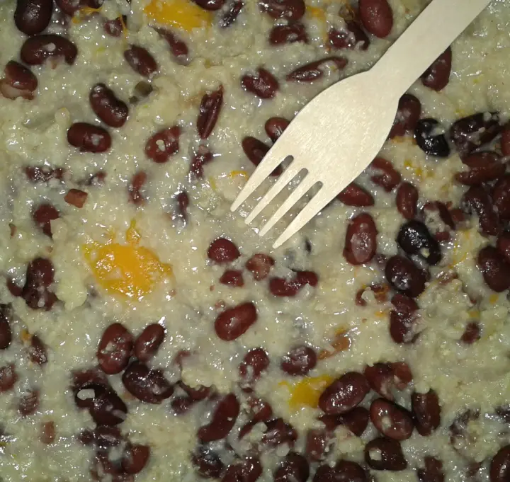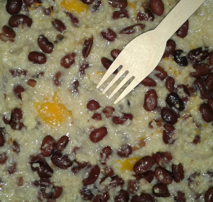 Here I put mung beans mixed with cabbage on top of round Lavash and covered it up with some egg, onion and garlic slices.